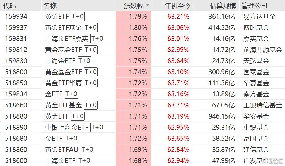 ETF方面,黄金基金ETF、黄金ETF、黄金ETF基金、上海金ETF、上海金ETF嘉实、金ETF、黄金基金ETF、黄金ETF基金、黄金ETF华夏、中银上海金ETF、黄金ETFAU上涨,年内涨幅超62%。